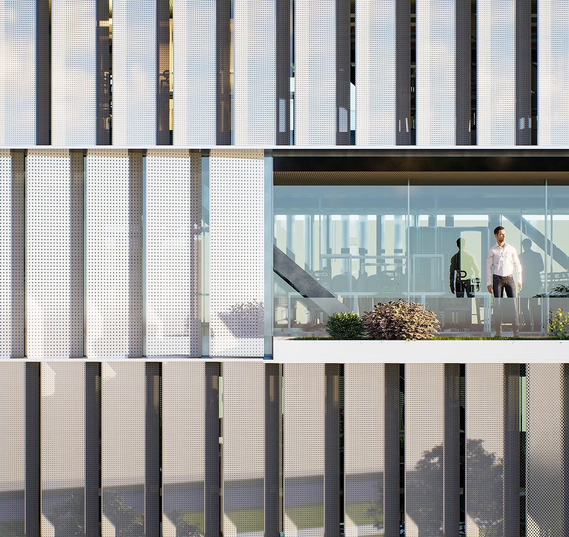 - Fachada inteligente: Lamas de aluminio perforadas que regulan la luz natural y reducen el consumo de climatización.
